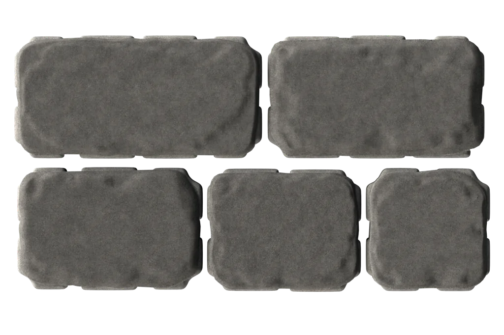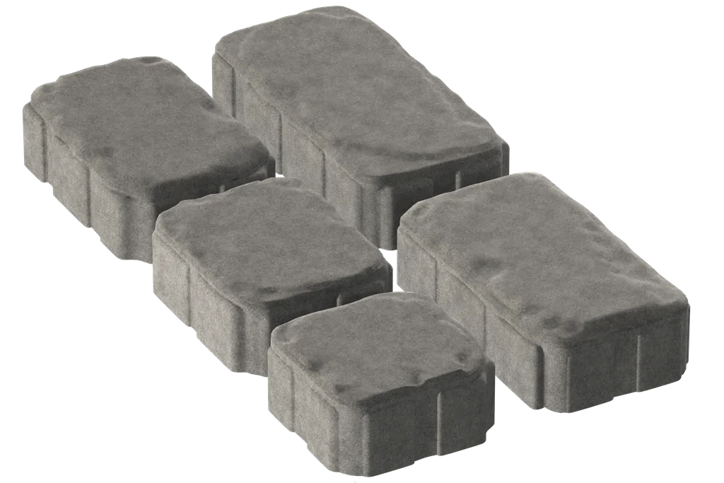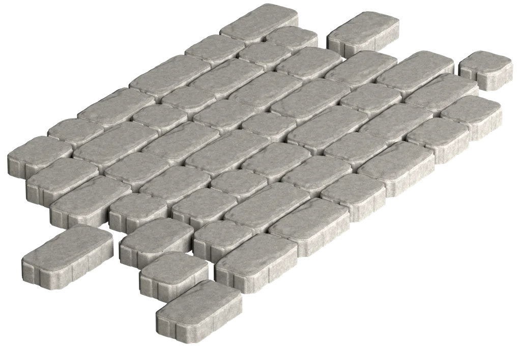 Элементы повторяют форму натурального булыжника: скруглённые края, неровная геометрия и выразительная рельефная поверхность создают эффект традиционного мощения. Плиты разных размеров формируют естественный, «живой» рисунок без строгой повторяемости, сохраняя атмосферу каменной мостовой в практичном бетонном исполнении.